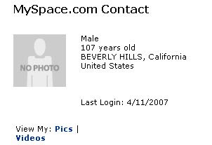 Sooooo MySpace.com Contact huh? And he’s 107 years old? Well I’m glad I’m not the only one telling whopping great big fibs on MySpace. But it gets me thinking – how do I know this is really a MySpace authorised person? Identity is a big challenge on the net. This is an issue we have grappled with for years in various virtual worlds and online communities I have worked with. I pretty well have it down pat now, but it’s interesting to see other networks figuring it out. Unfortunately MySpace haven’t. Let me show you just how badly they haven’t figured it out…